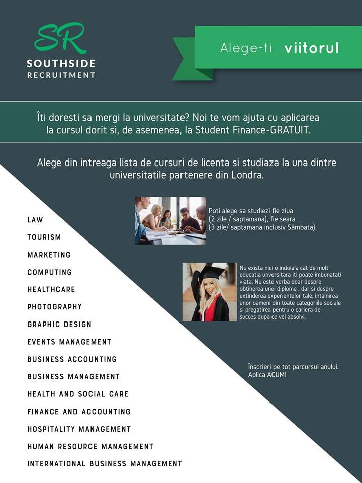 Avem de toate pentru toti! Si daca nu avem, facem rost! Noi vrem sa va ajutam sa cresteti pe scara sociala, aici in UK. Vine Brexit-ul si ne gandeam ca v-ar fi mai usor daca ati avea ceva calificari, plus ca nu va strica niste bani in plus de la guvern, ca tot platiti taxe. Ce ziceti? Va bagati? Daca nu aveti diploma de bacalureat va ajutam cu un Level 3 care va garanteaza un loc la univesitate in urmatorul intake. Daca nu vorbiti limba engleza va ajutam cu un curs gratuit! Avem si Education Studies pentru cei care vor sa devina profesori! Va ajutam cu aplicatia pt Student Finance si nu va vom minti cand va vom spune ca puteti lua pana la £11.000 maintenance loan. Si sa nu uitam : Daca ne aduceti un prieten si are succes puteti castiga £100. Sunati-ne la 07440502858 sau trimiteti-ne email la koidediana@gmail.com